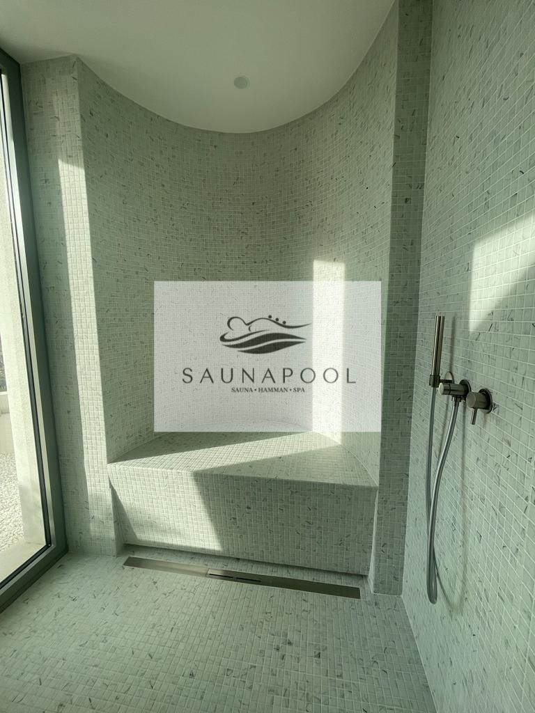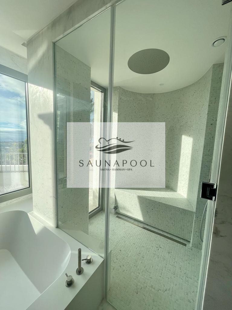 Baño turco en Costa del Sol, una de nuestras últimas instalaciones para una casa particular con un diseño redondo y todo un frontal acristalado para observar el paisaje exterior.